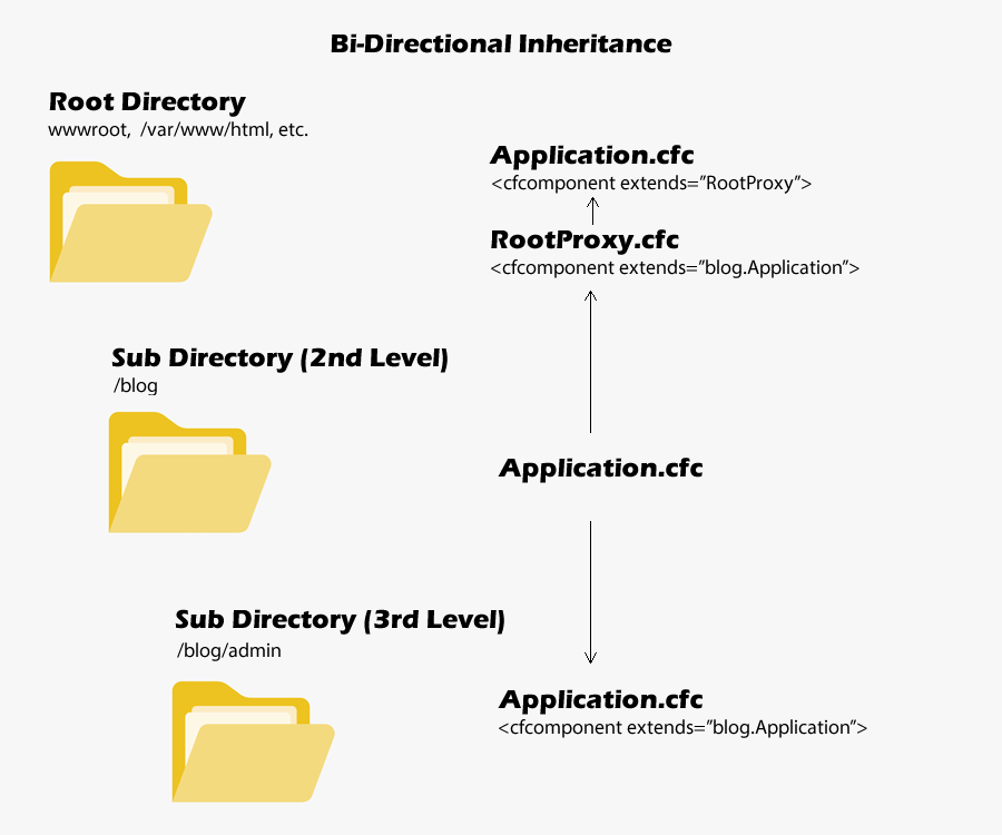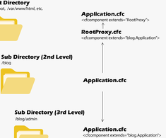 In this scenario, we will invert the previous example to extend an application inside a subdirectory to the application.cfc in the root directory using a proxy.cfc. Click on the thumbnail below to illustrate how to extend application.cfc's bi-directionally: