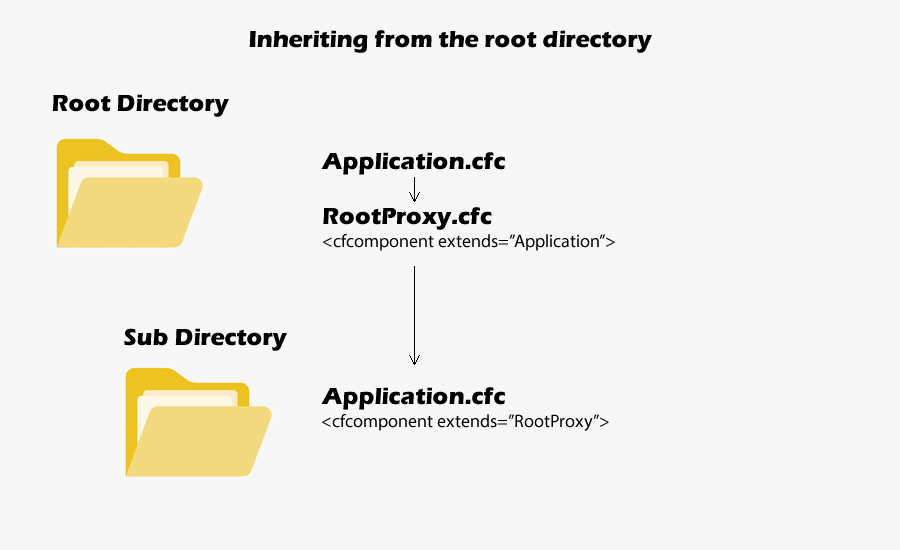 The directory structure does not govern the parent-child relationship. A parent component can be located in a subdirectory, whereas the child component can be placed in the root directory and we can flip the previous example upside down when extending a parent CFC, found in a subdirectory, to the root directory.